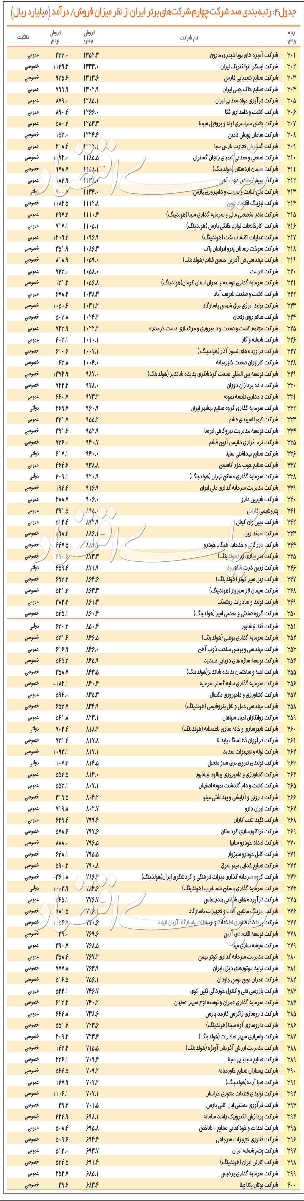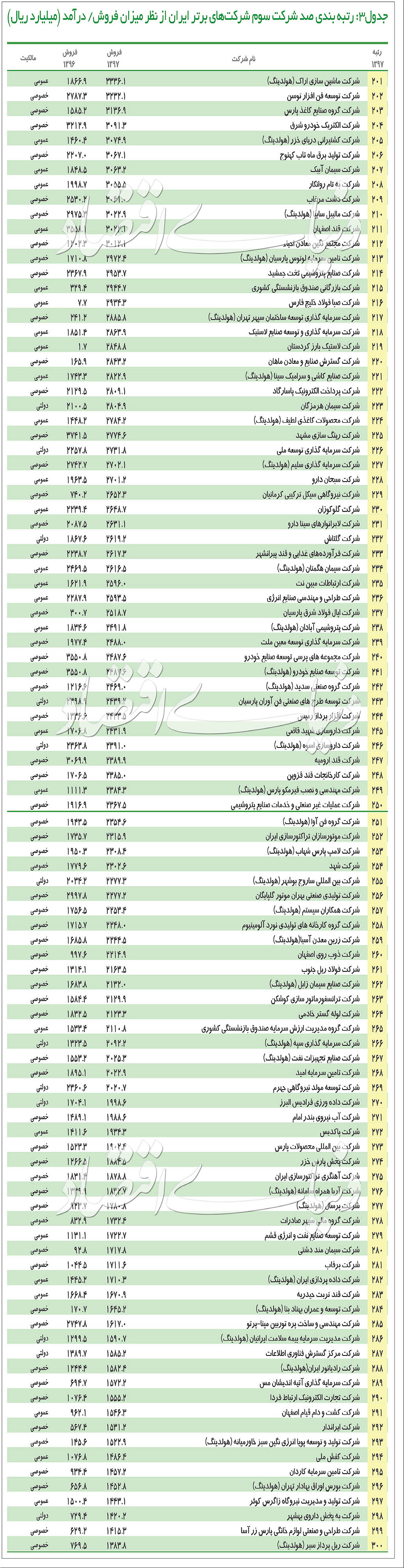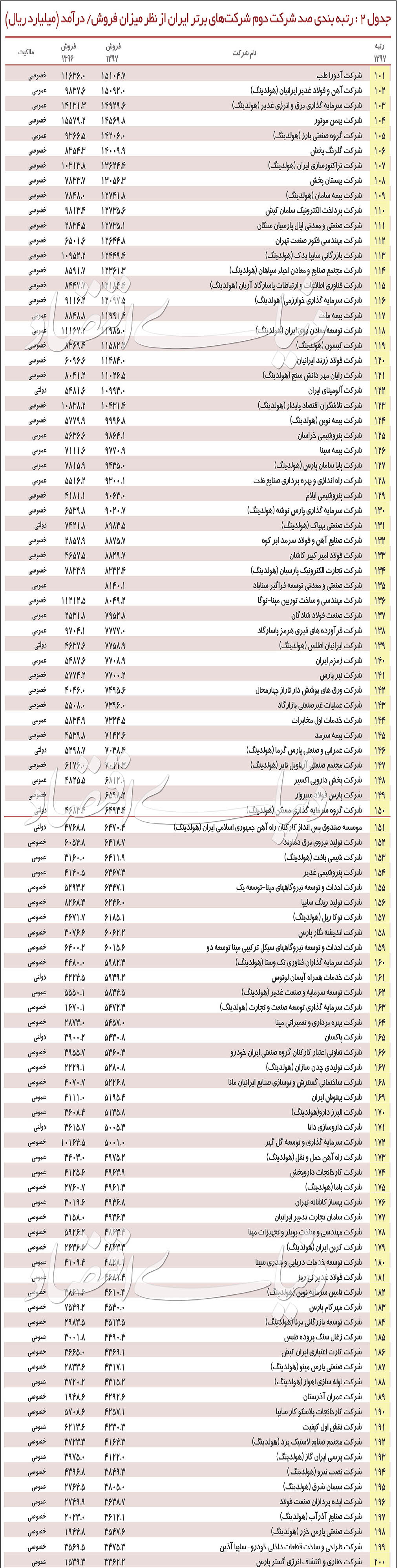 از سوی دیگر، نتایج اعلام شده نشان دهنده آن است که فروش شرکت اول فهرست نسبت به فروش شرکت صدم ۳۷ برابر بزرگ تر است. در مجموع ۱۴ شرکت بالای فهرست ۹/ ۵۰ درصد جمع فروش صدشرکت را شکل میدهد که این امر نشاندهنده درجه تمرکز در وضعیت شرکتهای بزرگ ایران است.