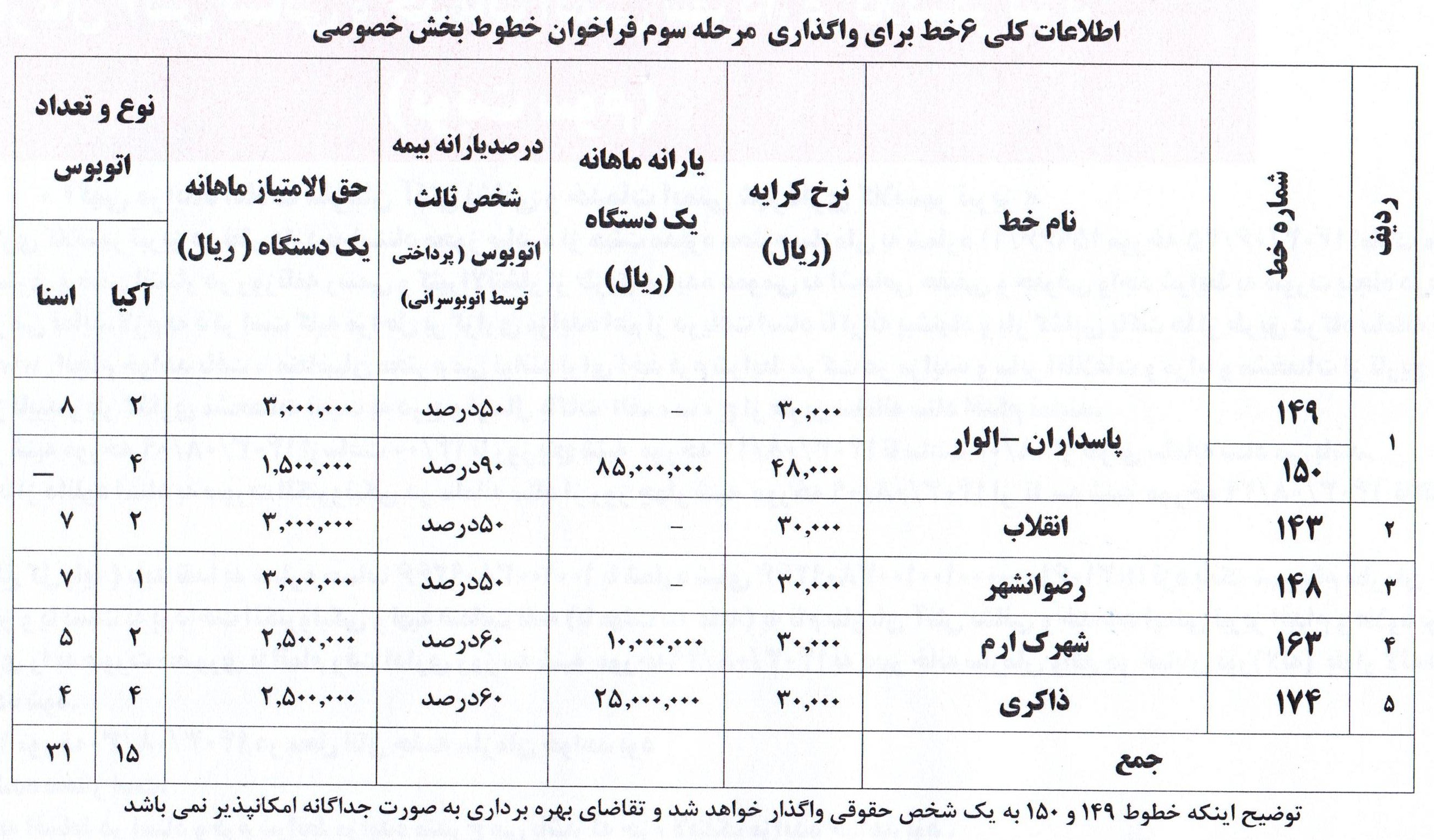 به گزارش نصر، محمد حسین زاده گفت: مرحله سوم فراخوان واگذاری ۴۶ دستگاه اتوبوس در ۶ مسیر با دو نوع اتوبوس ( آکیا و اسنا ) ۲۹ آبان ماه منتشر می شود.