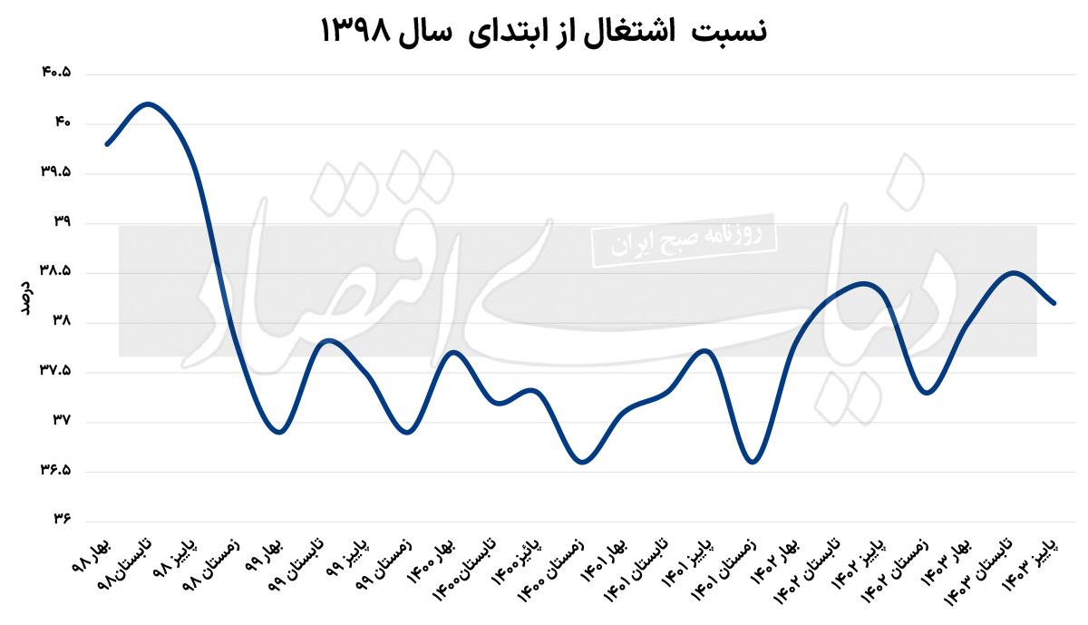 یکی دیگر از شاخصهای مهم در تحلیل بازار کار یک کشور نسبت اشتغال است. نسبت اشتغال نشان میدهد چه درصدی از افرادی که در سن کار هستند، شاغلاند. با توجه به کاهش نرخ مشارکت اقتصادی در پاییز سال جاری، نسبت اشتغال نیز در مقایسه با تابستان سال جاری با کاهش ۰.۳واحد درصدی مواجه بوده و به ۳۸.۲درصد رسیده است.