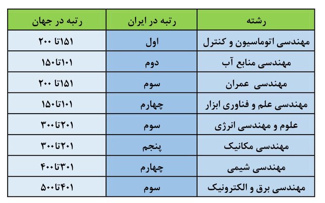 در این رتبه بندی دانشگاه تبریز در حوزههای مهندسی مکانیک و علوم و مهندسی انرژی نیز در رده 201-300 دنیا را بهدست آورده است.