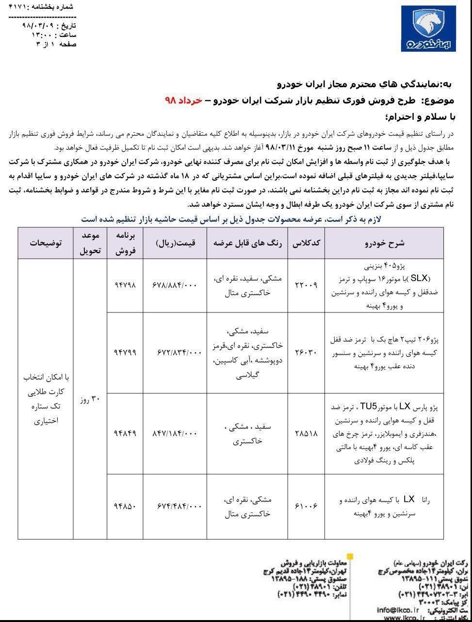 ایران‌خودرو در این اطلاعیه قیمت پژو ٢06 تیپ ٢  را 6٧ میلیون و ٢٨٣ هزار و 400 تومان، قیمت پژو پارس ال ایکس را ٨4 میلیون و ٧١٨ هزار و 400 تومان قیمت رانا ال ایکس را 6٧ میلیون 44٨ هزار و 400 تومان و پژو 405 بنزینی را  ٨٨٨ هزار و 400 تومان تعیین کرده است.