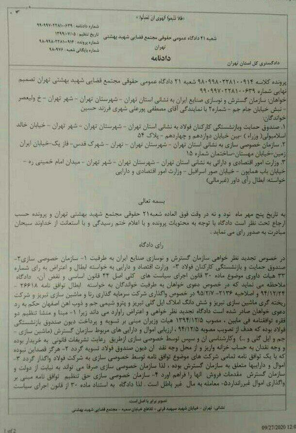 وی افزود: بالاخره هیات عالی داوری این موضوع را بررسی کرد و این هیات اساساً طبق مستندات محکمی که وجود داشت، هیچ حق و حقوقی برای صندوق بازنشستگی فولاد قائل نشد و سهام ماشین سازی تبریز تماماً به سازمان گسترش و نوسازی صنایع ایران بازگردانده شد.