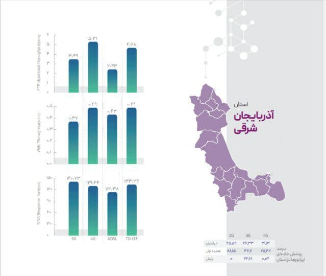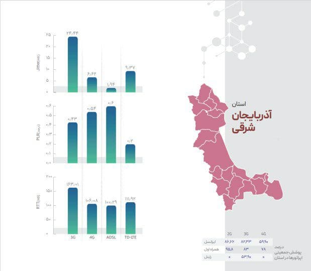 این گزارش حاکی است، در گزارش وضعیت کیفیت اینترنت ایران آمده است، رتبه آذربایجان شرقی در شاخص اینترنت موبایل پهن باند ۲۳، در ۳جی رتبه بیستم و در ۴جی رتبه بیست و هشتم را در بین استان های کشور به خود اختصاص داده است.