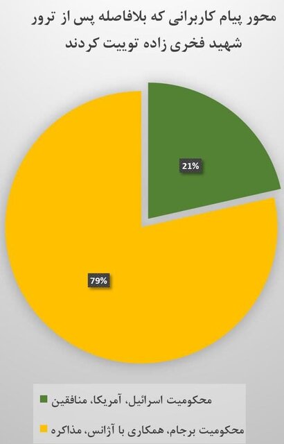 بررسی و تحلیل کلیدواژههای دههزار توییتی که در چند ساعت اول پس از ترور در فضای مجازی در این زمینه منتشر شد، نشان میدهد که حدود ٧٩ درصد توئیتها جهتگیری برای اختلافافکنی داخلی (مخالفت با برجام، همکاری با آژانس بینالمللی انرژی اتمی و مذاکره) تدوین شده و تنها ٢١ درصد آنها علیه آمران و عاملان این جنایت وحشیانه بوده است.