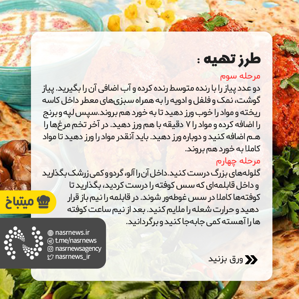 به گزارش نصر، آژانس خبری تحلیلی نصر به منظور معرفی این غذاهای دلپذیر بخش ویژه ای با نام "میتباخ" را ایجاد کرده است که قرار است در این بخش نحوه پخت این غذاها را نیز معرفی نماید.