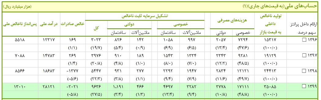 از این میزان، پس انداز ناخالص ملی در سال گذشته برابر ۱۳ میلیون و ۱۰ هزار میلیارد ریال بود.