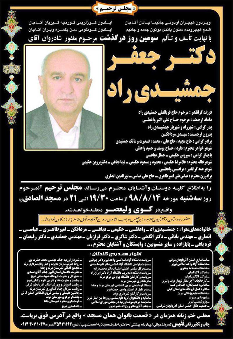 برگزاری مجلس ترحیم دکتر جعفر جمشیدیراد در تبریز