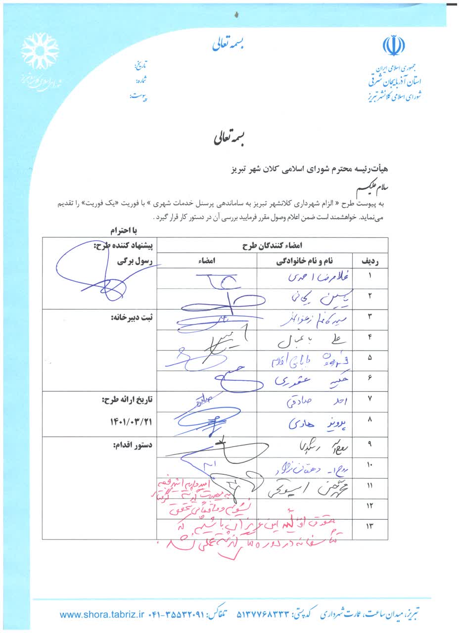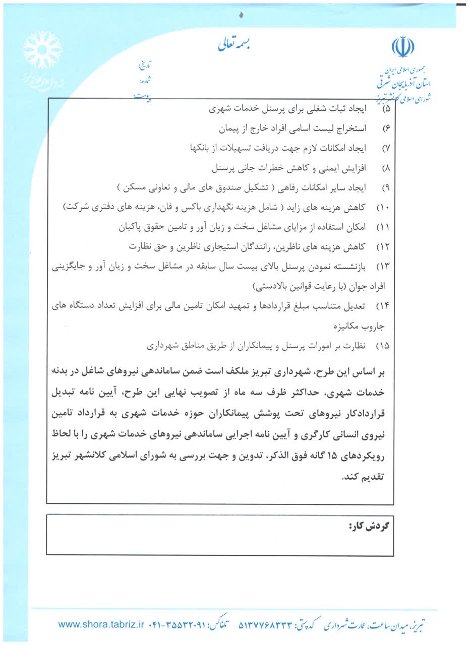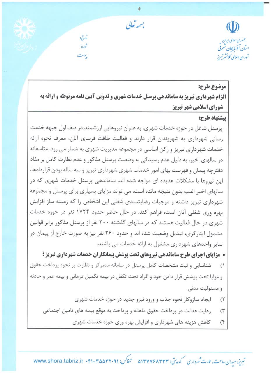 نصر: یک فوریت طرح "الزام شهرداری تبریز به ساماندهی نیروهای خدمات شهری" به تصویب اعضای شورای اسلامی شهر رسید.
