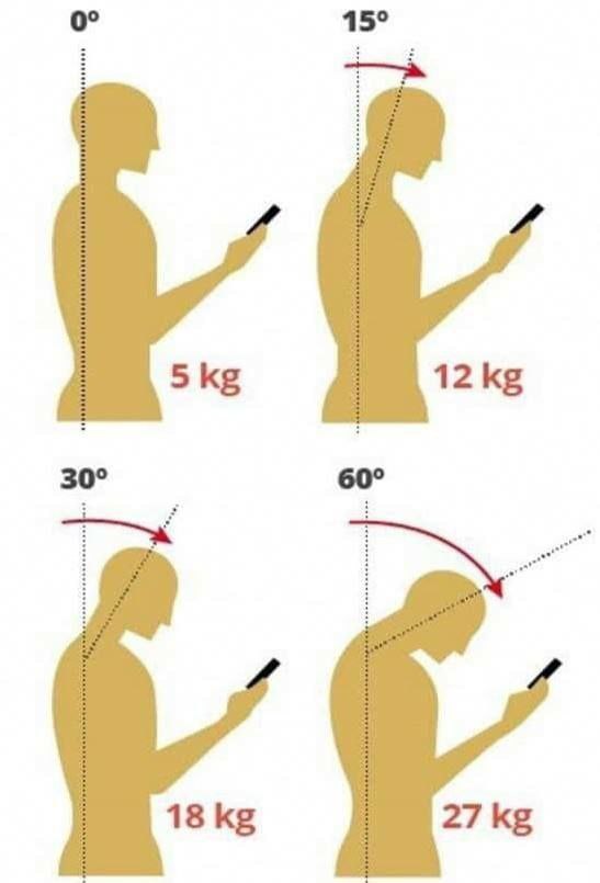 حال حالت کار با گوشی را در نظر بگیرید. همه ما هنگام ارسال پیامک با تلفن همراه، به طور معمول سر خود را به سمت جلو خم کرده و با زاویه 45 تا 60 درجه به سمت پایین نگاه می کنیم. این زاویه نیرویی در حدود 22.6 الی 27.2 کیلوگرم را به گردن فرد وارد می کند. طبیعی است که هیچ گردنی نمی تواند این مقدار از فشار را در یک دوره طولانی با موفقیت و تحت سلامت کامل تحمل کند.