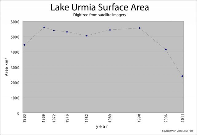 گراف زیر نشان میدهد که دریاچه ارومیه از سال ۱۹۹۸ تا ۲۰۰۶ با افت شدید مساحت مواجه شده و این روند به طرز فاجعه باری تا سال ۲۰۱۱ ادامه پیدا کرده است.