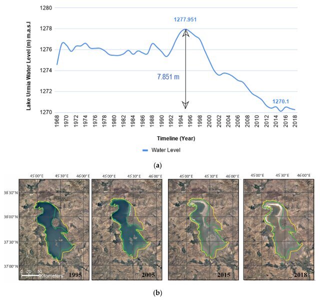 گراف ذیر نیز نشان دهنده سطوح آب از سال ۱۹۶۸ تا ۲۰۱۸ است که همانطور که قابل مشاهده است، سطح آب دریاچه ارومیه از سال ۱۹۹۵ میلادی کاهش یافته و در سال ۲۰۱۵ میلادی به کمترین حد خود رسیده است. با اینکه یک روند کمی افزایشی را در فاصله ۲۰۱۵ تا ۲۰۱۶ میلادی میبینیم، اما مجددا وضعیت این دریاچه رو به وخامت گذاشته است.