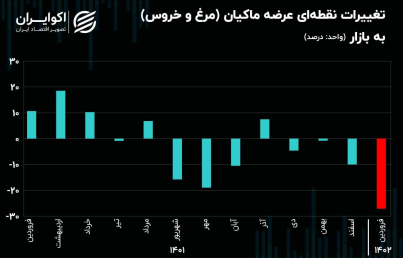 میزان افت ماهانه عرضه مرغ نیز طی دوره مورد نظر رکوردزنی کرده، به طوری که تغییرات ماهانه عرضه مرغ به بازار نشان میدهد طی دست کم دو سال اخیر بیسابقه بوده است. میزان عرضه ماکیان (مرغ و خروس) در فروردین ۱۴۰۲ نسبت به ماه قبل بیش از ۲۰ درصد کاهش یافته است.