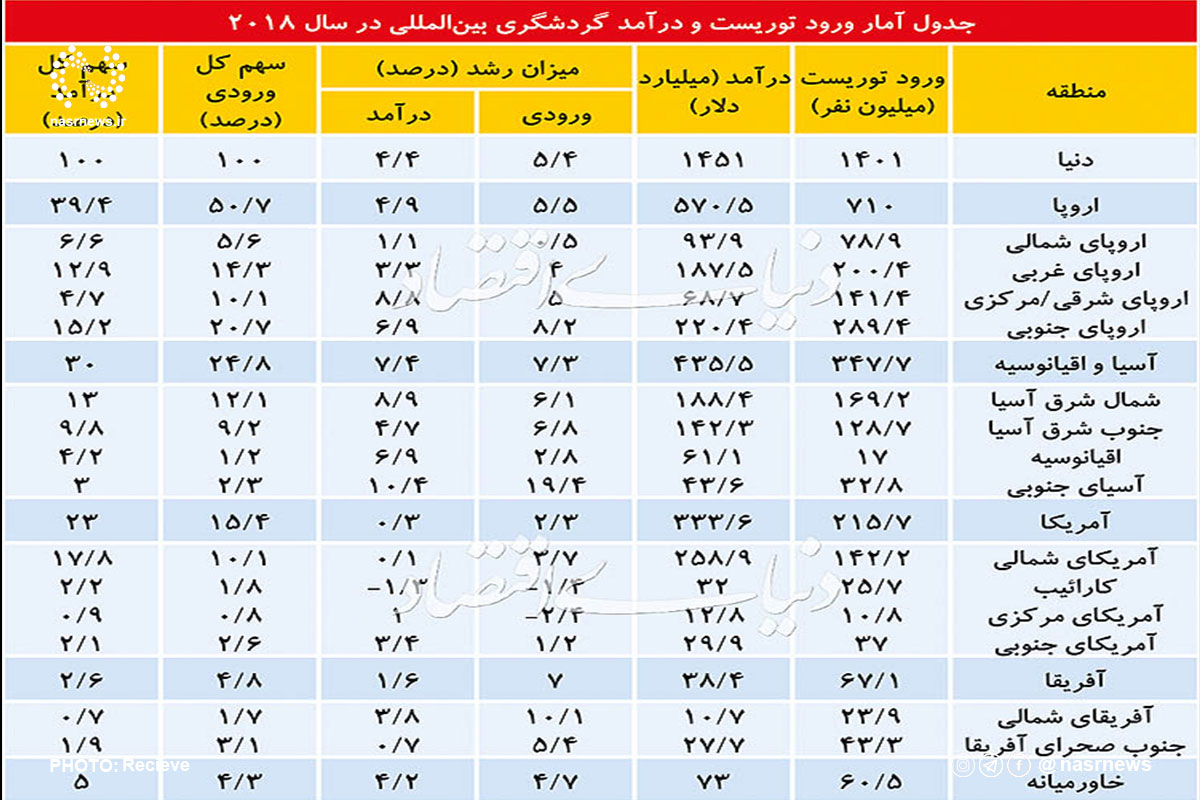 براساس این گزارش، طبق آمار سازمان جهانی گردشگری، میزان ورودی گردشگران جهان در سال ۲۰۱۸ حدود ۴/ ۱ میلیارد نفر بوده که نسبت به سال ۲۰۱۷ رشد پنج درصدی داشته است. آسیا و اقیانوسیه و بهدنبال آن آفریقا بیشترین رشد در ورود با رقم معادل هفت درصد را به نام خود ثبت کردند.